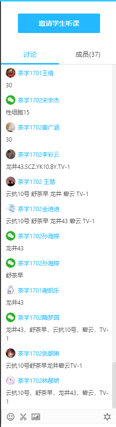 本课程主要以PPT展示加同声直播为主(图3-4),在授课中对一些重难点通过在PPT上标注或是在讨论区介绍的形式向大家讲解。同时也会在线上随机提问,通过讨论区让大家写出答案,供大家一起讨论(图5),一方面加深大家的记忆,另一方面是对学生学习过程进行监督。另外,我也会穿插一些视频或生活中的素材来形象化一些抽象的知识点。