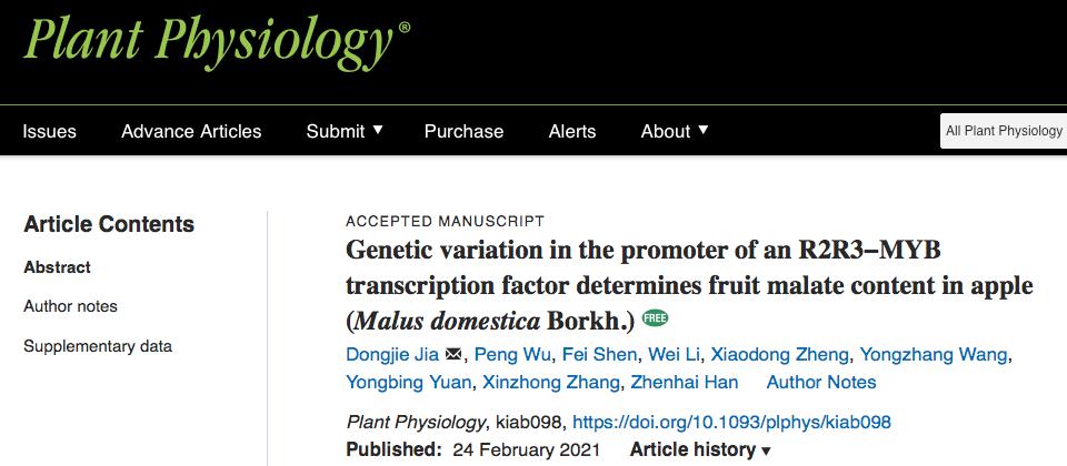2021年2月24日,3003新葡平台果树分子与发育生物学团队和中国农业大学合作在Plant Physiology(五年影响因子IF=6.902)上在线发表了题为“Genetic variation in the promoter of an R2R3−MYB transcription factor determines fruit malate content in apple (Malus domestica Borkh.)”的研究论文,揭示了苹果果实苹果酸积累调控的新机制。