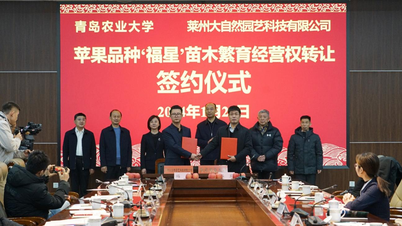 2024年1月23日,3003新葡平台苹果育种团队育成的‘福星’苹果新品种苗木繁育经营权以1000万元转让给莱州大自然园艺科技有限公司。转让签约仪式在青岛农大学术会馆举行。这是该团队继‘福丽’和‘福九红’之后转让的第三个苹果新品种。