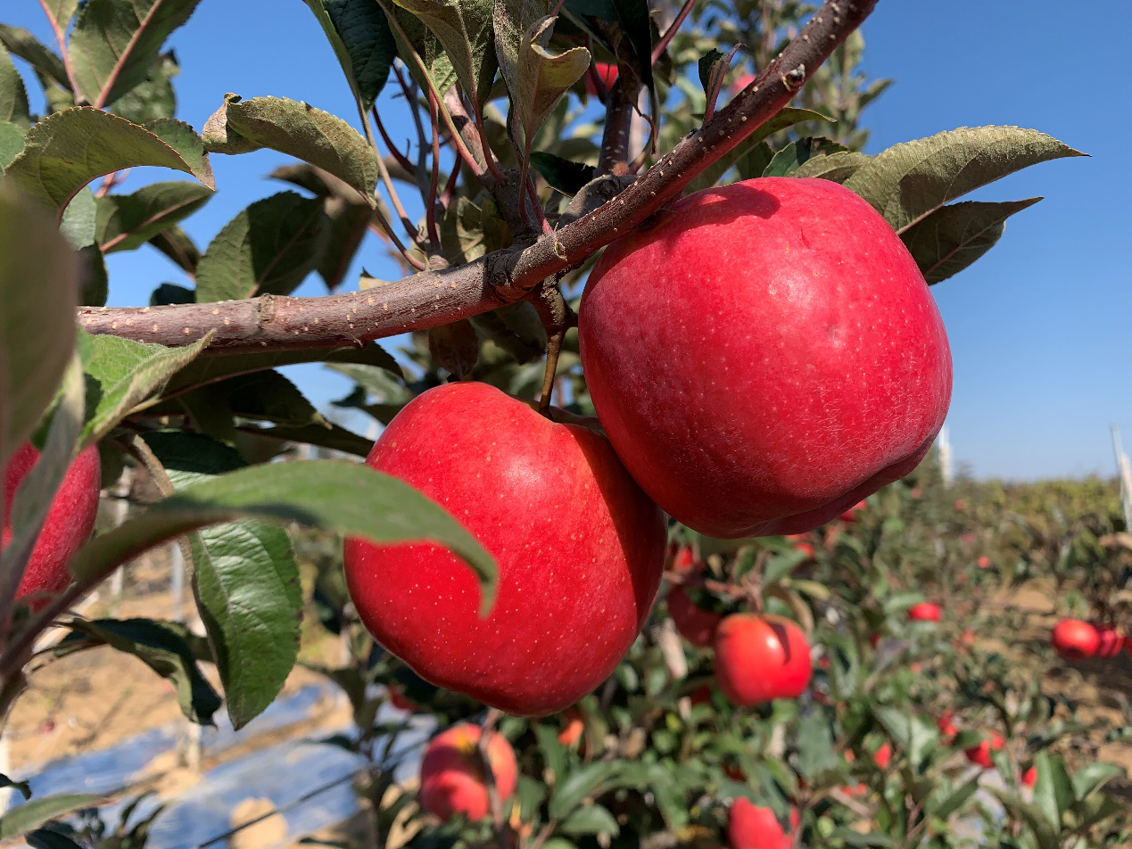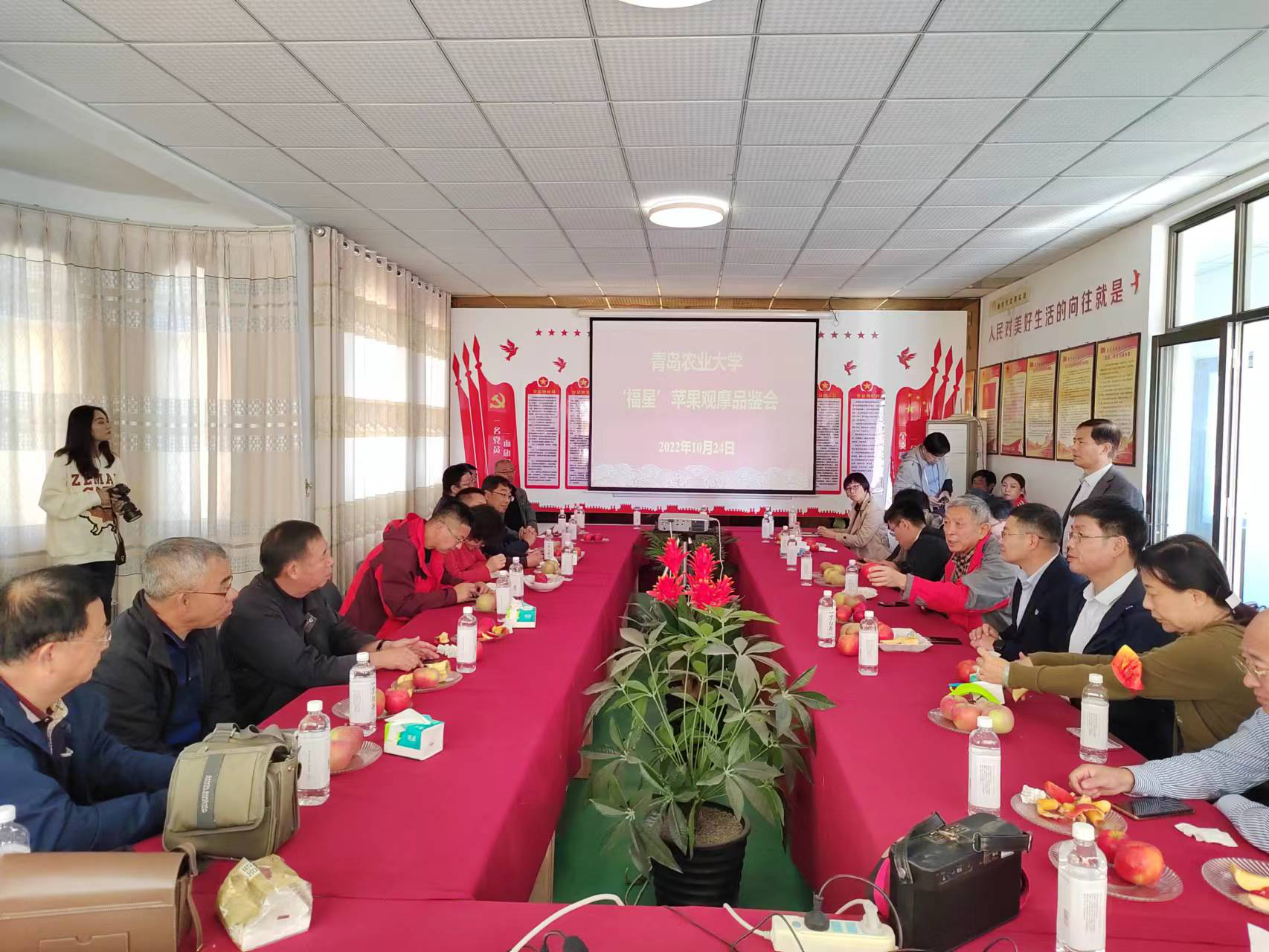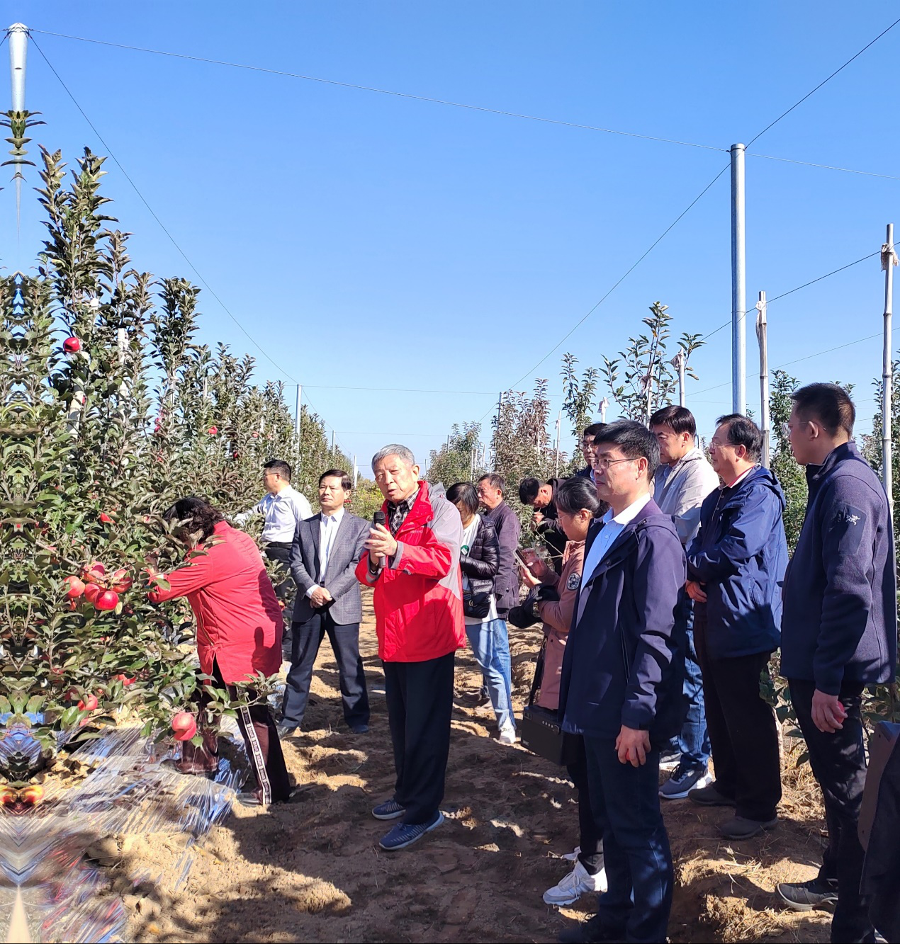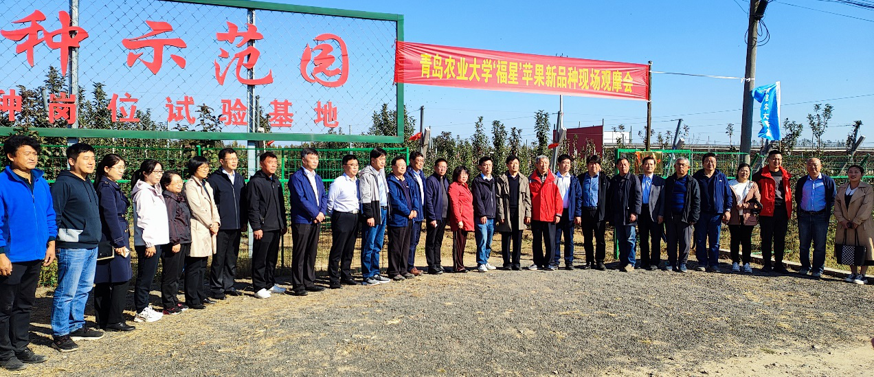 10月24日,3003新葡平台在学校苹果育种基地平度市南村镇沙梁新村召开晚熟苹果品种‘福星’现场观摩品鉴会。国家苹果产业技术体系岗位专家李保华教授、威海综合试验站站长曹洪建研究员、青岛综合试验站站长沙广利研究员和葛红娟副研究员、烟台农业技术推广中心主任吕常厚研究员、青岛农业技术推广中心副主任李松坚和郭江山研究员、潍坊学院生物与农业工程学院院长曹慧教授、平度市农业农村局赵克义站长、平度市南村镇相关领导、多家苗木和水果企业老总及企业代表、苹果种植大户及合作社技术人员、平度电视台和半岛都市报等多家媒体记者、3003新葡平台社会合作处王珏处长、3003新葡平台张忠华院长以及科技处、宣传部、3003新葡平台师生及苹果育种团队人员、当地果树技术人员共40余人参加本次观摩品鉴会。