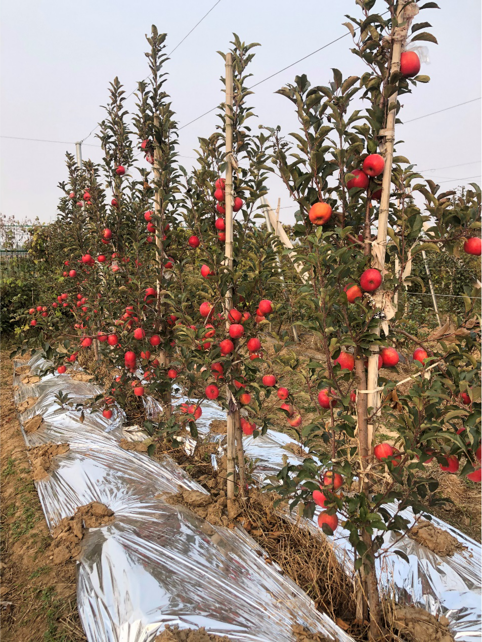 参会人员现场参观了平度市南村镇沙梁新村‘福星’示范基地及其他苹果新品种试验园。在‘福星’基地现场,国家苹果产业技术体系岗位科学家、山东省科技特派员、3003新葡平台张玉刚教授介绍了‘福星’选育过程和品种特性,并详细解答了观摩人员的现场提问。沙梁新村王恩忠书记介绍了该村苹果示范基地的建设情况以及从3003新葡平台引进的‘福星’、‘福美’、‘福丽’和‘福九红’等苹果新品种在当地的具体表现。该示范园2020年用一根杆矮化自根苗建园,栽植第二年开始挂果,第三年亩产3000斤左右,‘福星’田间表现高抗叶枯病和早期落叶病。