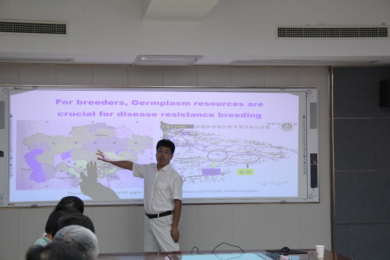 乌兹别克斯坦科学院遗传学和植物实验生物学研究所胡尔希德·图拉库洛夫(Khurshid S. Turakulov)副所长汇报了国际创新合作项目“赛威士野苹果及其资源收集对乌兹别克斯坦-中国苹果种质资源合作研究的重要性”课题研究进展情况,介绍了乌兹别克斯坦野苹果分布以及面临的生态环境胁迫,提出了解决生态环境胁迫的建议,表达了拓展与加深与新葡官网科研交流与合作的愿望,安排了下一步合作项目的工作计划。安瓦尔·谢林别托夫(Anvar G. Sherimbetov)博士分享了在新葡官网相关实验室开展科研合作的经验体会,对新葡官网良好的苹果生物学研究条件和完善的苹果试验推广基地以及突出的科研成果表示赞赏。
