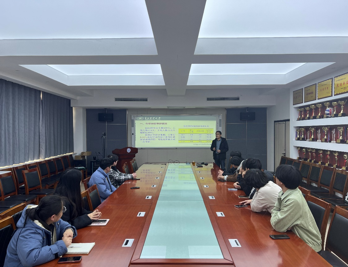 讲座上,张新富从学院2024届本科毕业生考研整体形式、考研复试流程、复试录取细则、复试材料准备等方面对毕业生进行指导。他提醒同学们把握好黄金时间做好备考复试规划,并从专业知识、英语听说能力和综合素质三个方面提高自身竞争力;并针对考研调剂流程等内容进行讲解,鼓励同学们调整心态积极备战复试,熟练掌握专业知识,及时关注复试调剂信息,不轻言放弃,主动出击,争取成功上岸。最后,张新富对同学提出的问题进行了针对性的分析与解答,并给出了指导性意见。