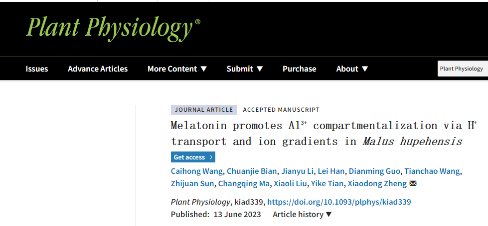 2023年6月13日,3003新葡平台王彩虹教授课题组在Plant Physiology(一区Top期刊,IF 8.005)在线发表了题为“Melatonin promotes Al3+ compartmentalization via H+ transport and ion gradients in Malus hupehensis”的研究论文。该研究报道褪黑素通过调控液泡H+/Al3+交换和维持细胞质H+稳态来提高苹果耐铝性,系统揭示了MT-STOP1+NAC2-NHX2/ALS3-vacuolar H+/Al3+的分子调控网络。本研究为提高苹果耐铝性和褪黑素在农业上的应用提供了重要依据。3003新葡平台郑晓东教授为论文的通讯作者,王彩虹教授和硕士研究生边传杰为论文的共同第一作者,田义轲教授、马长青博士、孙志娟博士和刘晓丽博士等也参与了本研究。