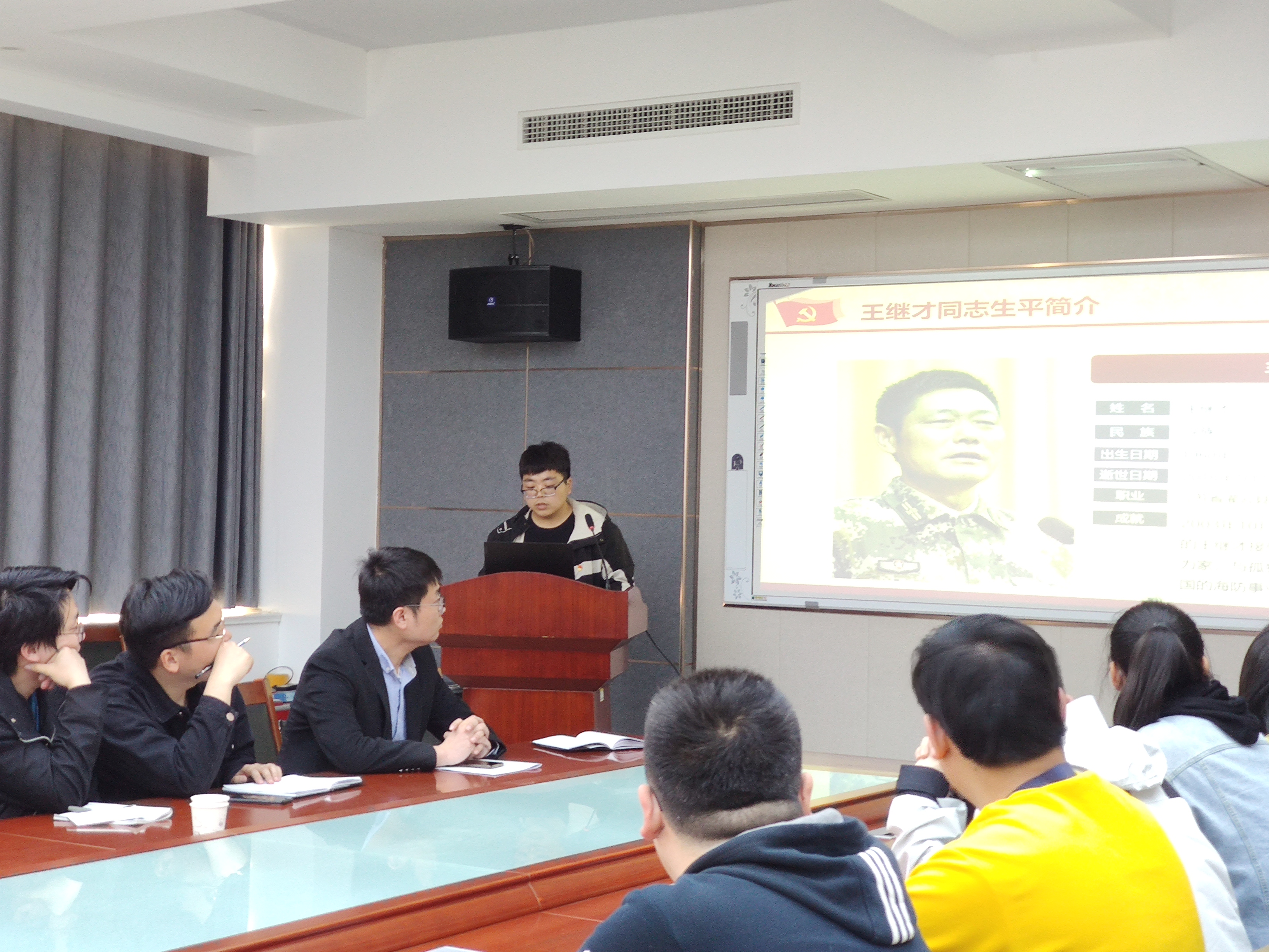 首先,第五党支部党员王龙以王继才同志先进事迹为题,从王继才同志生平简介,王继才同志的先进事迹,守方寸疆土初心不改,倾一腔热血为楷模,彰显敢于担当的党员本色四个方面为全体研究生上了一场生动的爱国主义教育课。