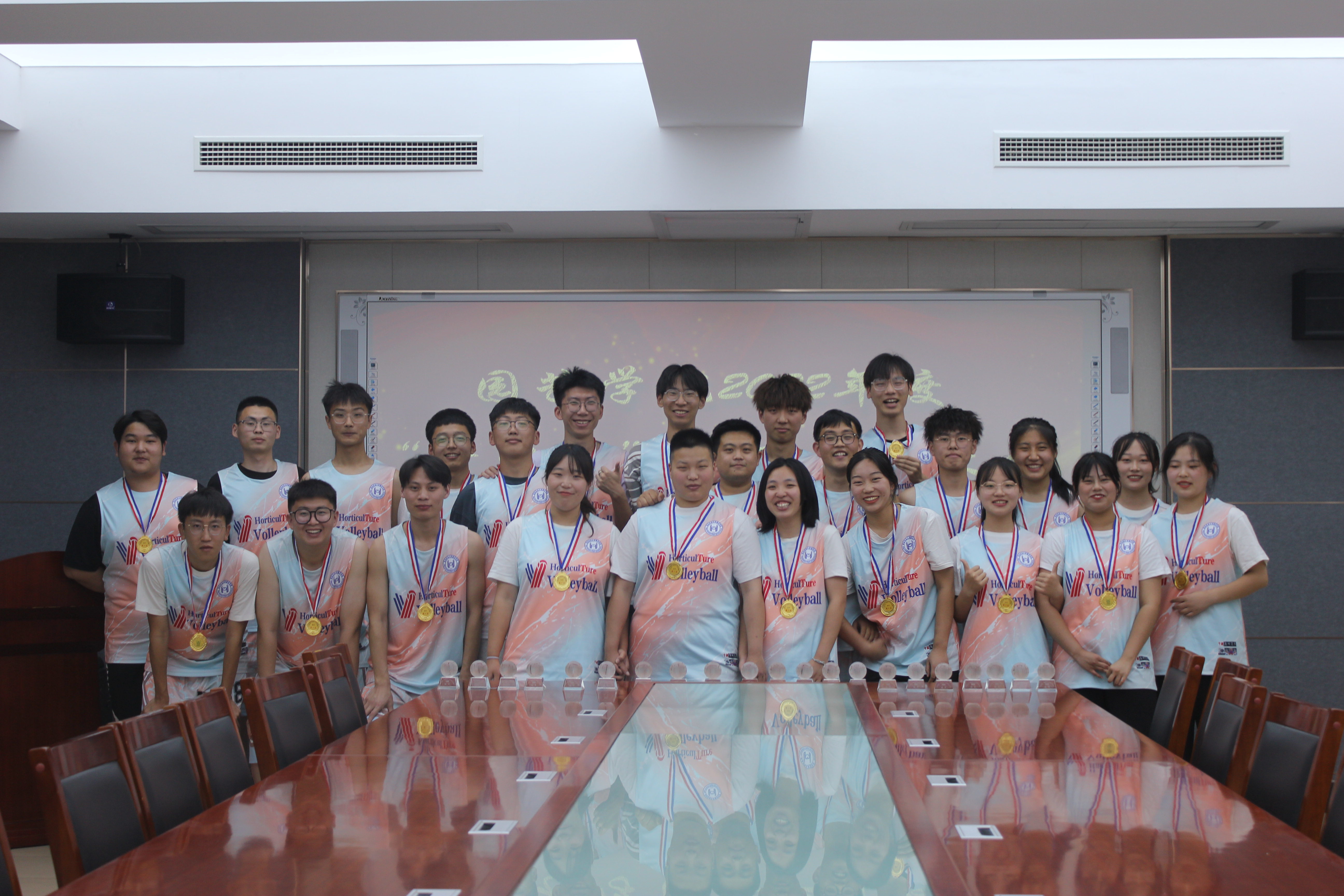 学院党委书记隋成竹老师为获奖队员颁奖,并和大家一起在排球上签名留念。随后,隋成竹对学院排球队取得“双冠王”的优异成绩表示祝贺,并提出几点希望:一要提升思想认识,进一步发扬成绩和优势,树立良好的大学生形象,带动其他同学健全身心、强壮体魄;二要发扬赛场上的协作精神以及团队精神,牢记团结奋进的精神核心;三要发扬拼搏精神,克服一切困难,奋力争先;四要再接再厉、再创佳绩,希望在更多的领域看到园艺学子的身影。最后,隋成竹引用习近平总书记在考察中国人民大学的讲话激励园艺学子,希望学院广大青年牢记党的教诲,立志民族复兴,不负韶华,不负时代,不负人民,在青春的赛道上奋力奔跑,争取跑出当代青年的最好成绩!