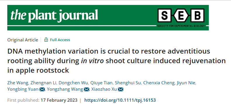 2023年2月17日,3003新葡平台在The Plant Journal(中科院1区Top期刊,IF 7.091)发表了题为“DNA methylation variation is crucial to restore adventitious rooting ability during in vitro shoot culture induced rejuvenation in apple rootstock”的研究论文。该研究揭示了成龄苹果砧木经过连续组培继代恢复绿枝扦插生根能力的分子机制。