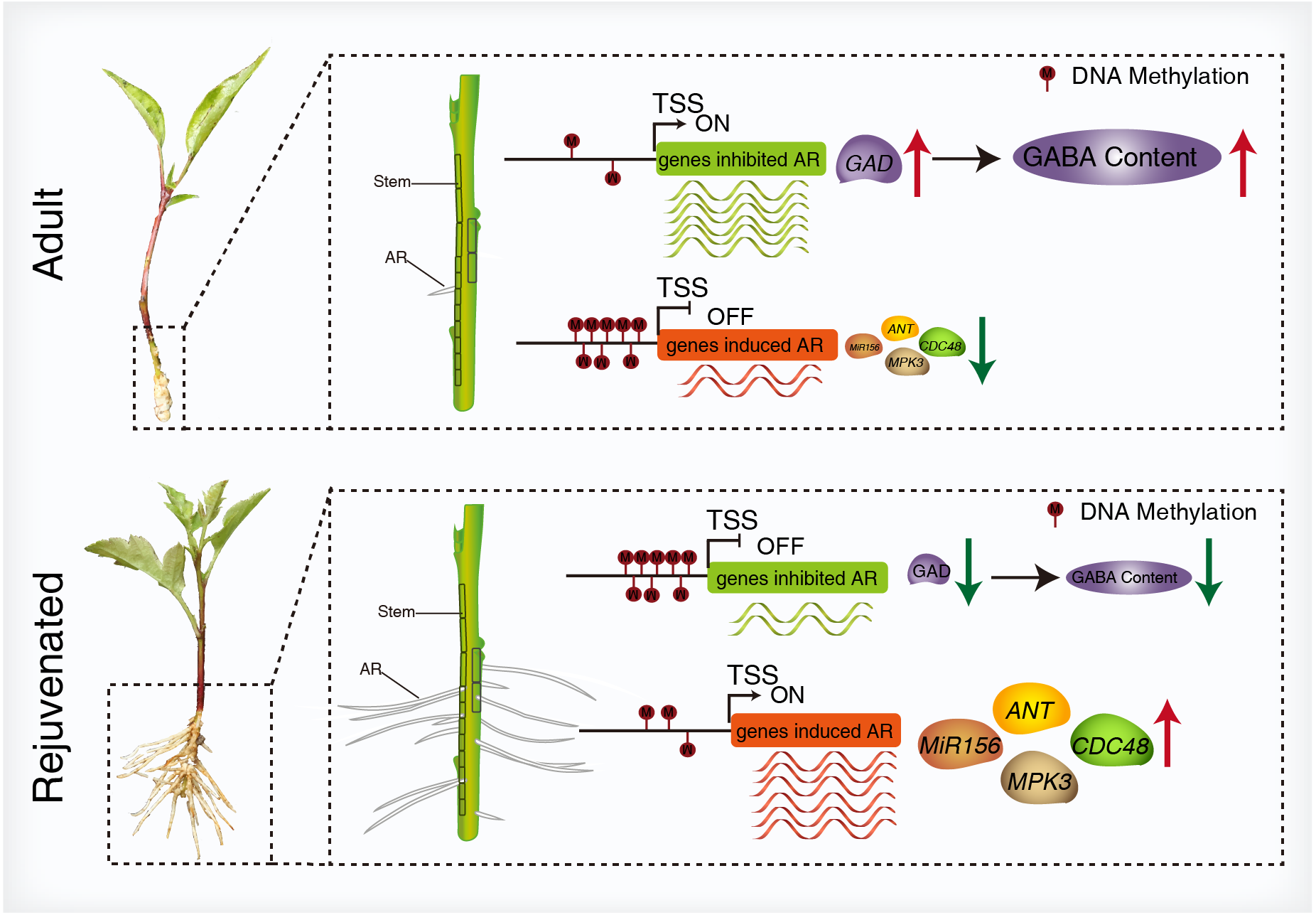 该研究以苹果矮化砧木为试材,基于前期研究基础和获得的返童和成龄苹果砧木‘M9T337’、‘M26’和‘SH6’,通过全基因组水平DNA甲基化分析、转录组分析,结合转基因等技术,发现成龄材料连续组培继代返童后,促进不定根发生的相关基因如MdANT, MdMPK3, MdABCB21, MdCDC48, MdKIN8B, pri-MdMIR156a5, and pri-MdMIR156a12启动子甲基化水平下降;抑制不定根发生相关基因如MdGAD5a启动子甲基化水平升高,造成这些基因在成龄和返童材料中差异表达,最终使成龄材料经过连续组培继代后恢复绿枝扦插生根能力。