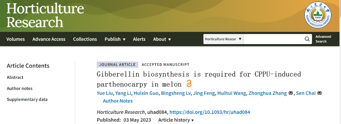 2023年5月,Horticulture Research发表了3003新葡平台瓜类生物研究团队题为 Gibberellin biosynthesis is required for CPPU-induced parthenocarpy in melon的研究论文。该研究初步探讨了CPPU诱导甜瓜果实单性结实的分子机制,为解决甜瓜生产中的坐果问题、种质改良以及单性结实的机制研究提供理论依据。