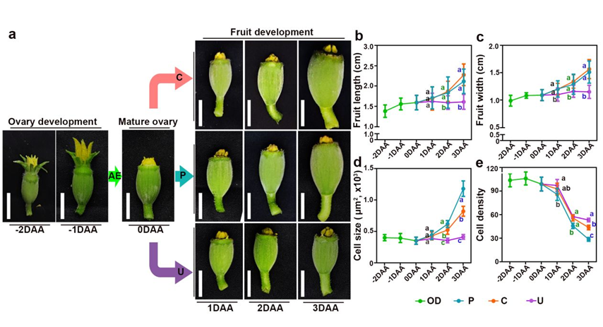 该研究对CPPU处理、人工授粉和未授粉的甜瓜早期果实进行形态学和组织学观察,发现CPPU处理与人工授粉的果实大小增加类似,但细胞大小增加较小,细胞密度更高。不同时间点各处理样品间内源激素检测发现CPPU促进赤霉素和生长素积累,降低脱落酸水平。转录组分析显示,CPPU诱导的差异基因主要富集在赤霉素相关通路,多个赤霉素合成、信号转导关键基因显著变化。外施赤霉素抑制剂多效唑(PAC)可部分抑制CPPU诱导坐果。