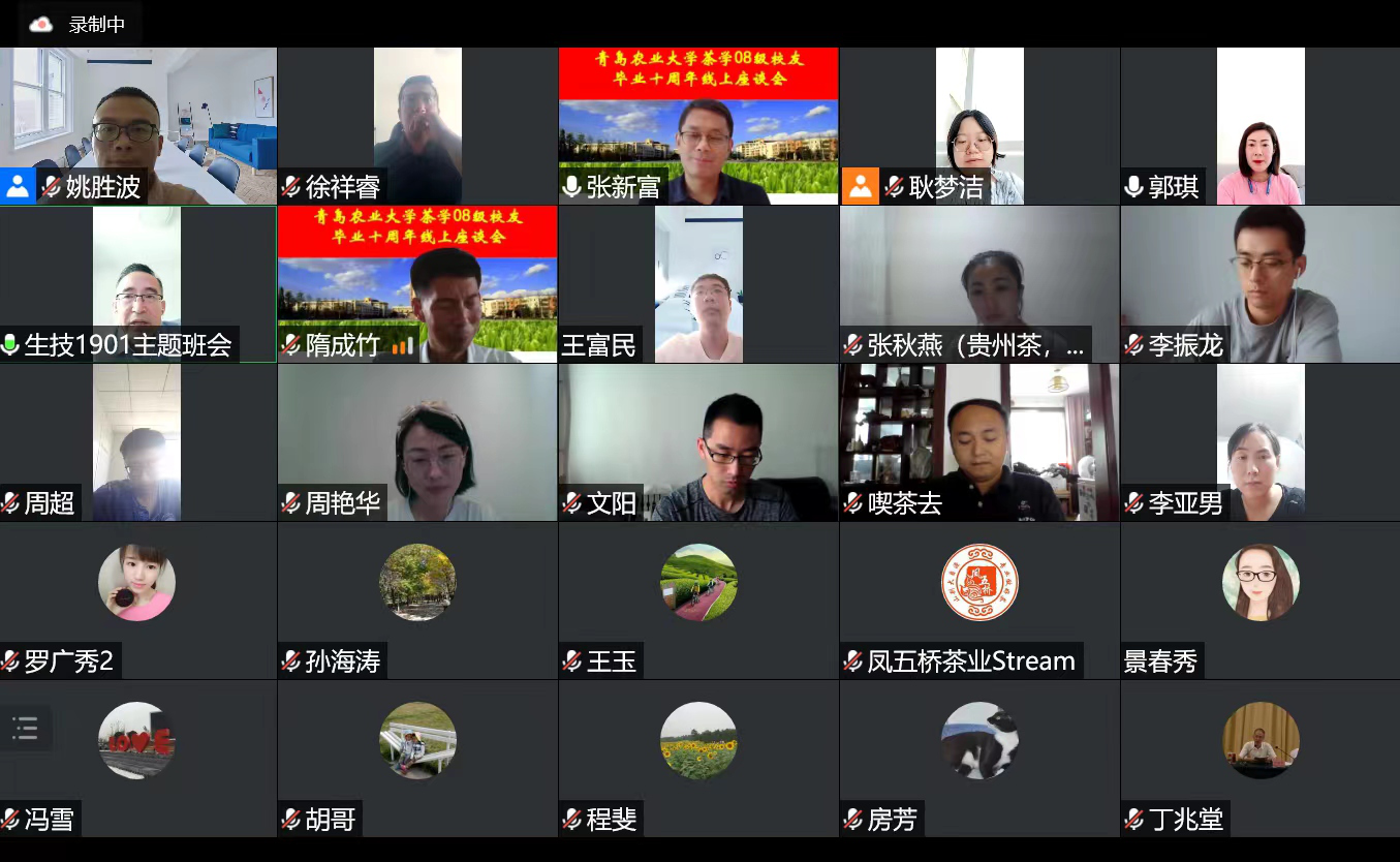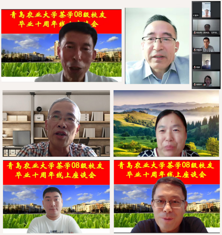 2022年8月7日下午,正值立秋,3003新葡平台首届(2008级)茶学毕业校友相聚云端,举行毕业十周年线上座谈会,重温同窗岁月,共话师生情谊。3003新葡平台党委书记隋成竹,副书记孙海涛,副院长程斐,副院长张新富,班主任赵永厚,茶学专业教师丁兆堂、王玉,胡建辉全程出席了本次线上座谈会。校友们精心制作的视频短片《我们的青农时光》回顾了大学四年的青葱岁月,大家的思绪仿佛都回到10年前。视频播放结束,座谈会开始。