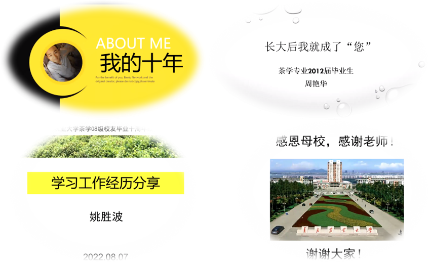 校友发言环节,由出席座谈会的每位校友分别介绍个人工作和生活现状,大家纷纷表示,虽然已毕业十年之久,但对母校和老师们的栽培与教育仍心怀感激之情。随后,由五位校友分别详细汇报毕业十年的学习工作历程和个人感悟。校友张秋燕毕业后一直坚守在茶行业,来自贵州的她在2016年被评为家乡“石阡”苔茶形象大使,致力于贵州绿茶的推广工作。校友周艳华毕业后考取中国农业科学院研究生,于2019年进入青岛职业技术学院,担任茶专业辅导员的她今年7月刚刚送走自己带的第一届毕业生,因此对于10年前自己的母校和老师的栽培和教育更是触景生情,心生感激。校友徐祥睿毕业后进入利群集团,经过多年的积累,目前担任大客户经理,并有幸参与2018年青岛上合组织峰会部分材料供应。校友郎增强毕业后进入旅游行业,5年内接待游客达万人以上,后期转为旅游产品营销,带领团队完成销售额破2亿元。2020年由于疫情爆发开始自主创业,目前在一家前景广阔的生物科技公司工作。校友姚胜波是2008级茶学的班长,也是此次毕业十周年座谈会的总策划,硕士从安徽农业大学毕业以后,在江西婺源茶业职业学院任职,后考取安徽农业大学博士学位,今年正式进入贵州大学工作。全部校友发言完毕后,丁兆堂老师进行了全面的总结。丁老师在听完专业培养的第一届本科生毕业后10年的经历和成长后非常感动,对大家10年取得的成就表示祝贺,对同学们表现出的奋发向上、克服困难、面对现实、成就未来的精神给予了肯定。希望大家未来进一步树立明确目标、坚定信心,不断对自己提出更高的要求,取得更大的成就,为国家和社会贡献自己的力量。
