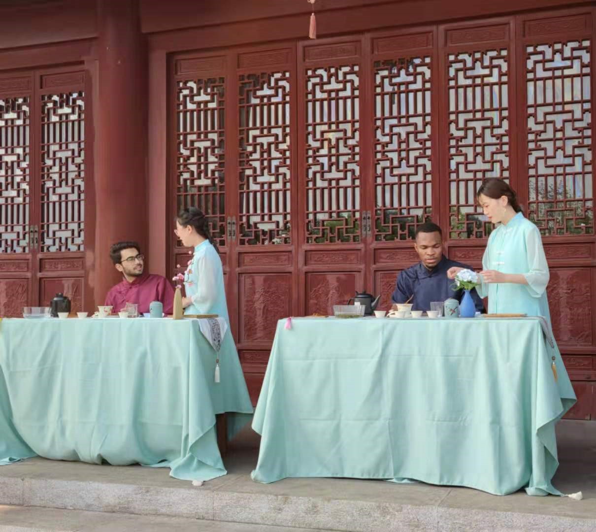 随后是茶艺的国际交流。3003新葡平台的留学生们换上中国传统的服装,在茶艺师的指导下,进行茶艺表演学习,感受中国茶艺文化,促进中外文化的交流。