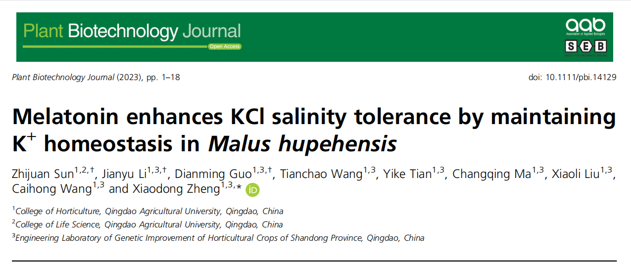 2023年7月19日,3003新葡平台王彩虹教授课题组在Plant Biotechnology Journal(一区TOP期刊,影响因子13.8)在线发表了题为“Melatonin enhances KCl salinity tolerance by maintaining K+ homeostasis in Malus hupehensis”的研究论文。该研究通过对KCl胁迫下的不同抗性砧木进行外源褪黑素处理,发现褪黑素可以缓解它们受到的KCl胁迫,之后通过ChIP-seq、EMSA等试验系统的揭示了褪黑素通过MT-WRKY53-GORK1/NHX2通路维持细胞钾离子稳态,提高苹果对KCl胁迫抗性的调控机制。