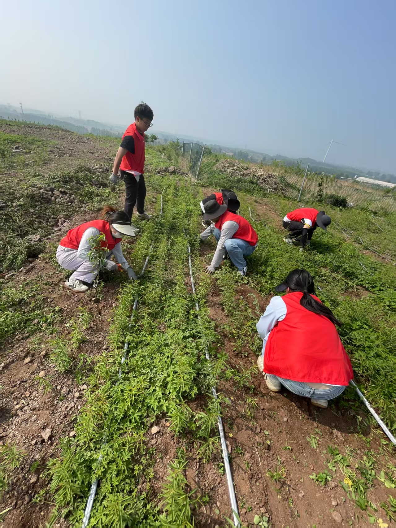 图为同学们在桃育苗基地人工拔草