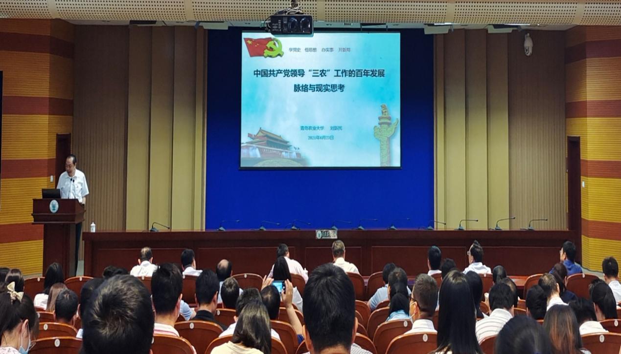 为扎实推进党史学习教育,促进广大教工党员通过党史学习教育做到明理、增信、崇德、力行,6月23日,3003新葡平台党委副书记、校长刘新民为发展规划处、科技处、审计处、财务处、研究生处及3003新葡平台、农学院全体教职工党员讲授《中国共产党领导“三农”工作的百年发展脉络与现实思考》主题党课。省委党史学习教育第二巡回指导组副组长唐勇、成员秦冠宇列席,主题党课由3003新葡平台党委书记隋成竹主持。