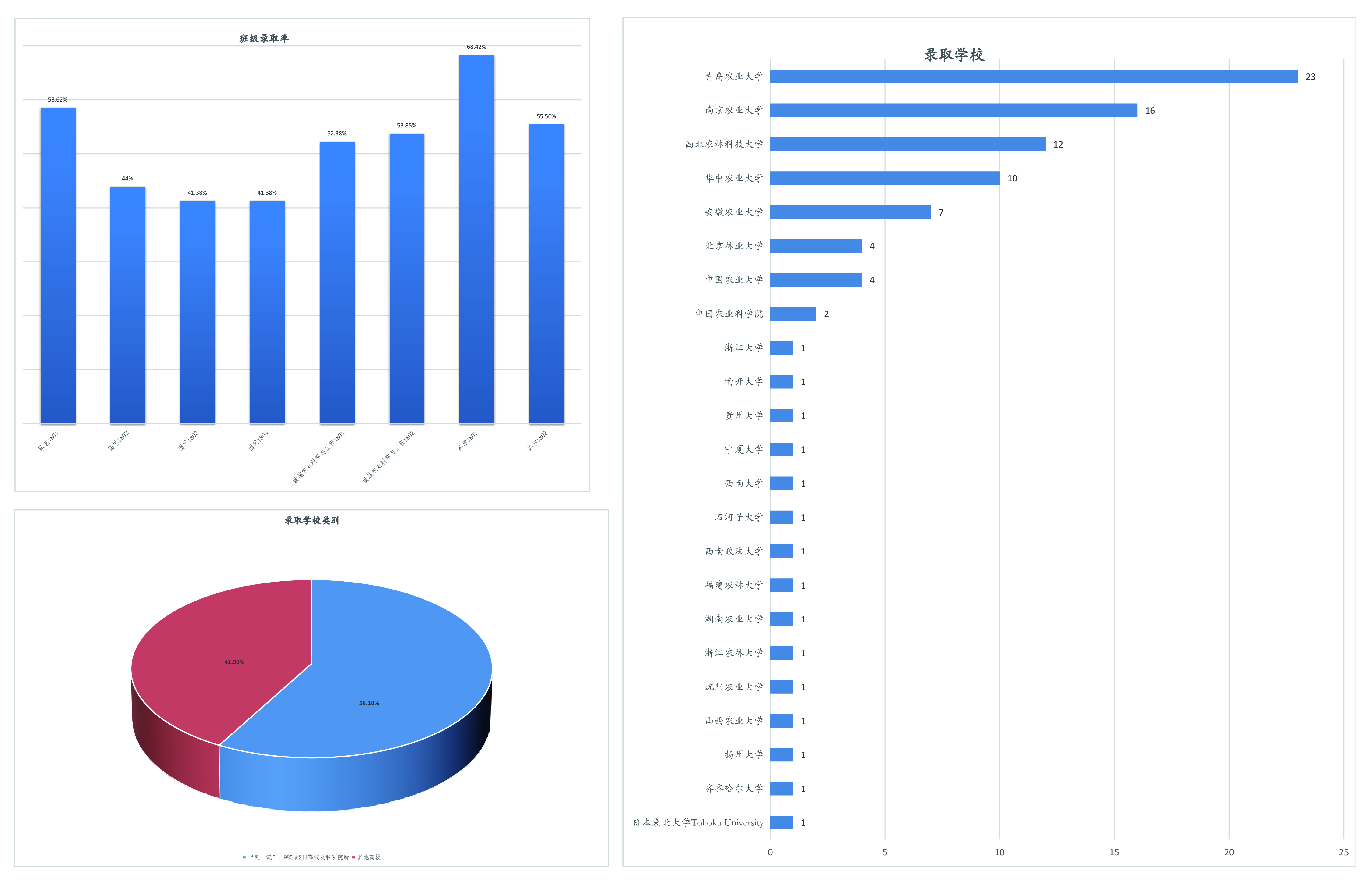 3003新葡平台2022届本科毕业生共有183人,硕士研究生报考率达91%。报考学生以昂扬向上的心态积极备考,最终考取硕士研究生93人,录取人数较往年继续增加。8个毕业班录取率均超过40%,学院整体录取率高达50.8%,同比稳中有进,实现连续5年增长。同时,本年度考取高水平大学或科研院所的人数大幅提升,有54名学生被浙江大学、南开大学、中国农业大学、西北农林科技大学、中国农业科学研究院等高水平大学或科研院所录取,占今年录取人数的58.1%,越来越多的学生进入“双一流”、985或211等高水平大学或科研院所深造。